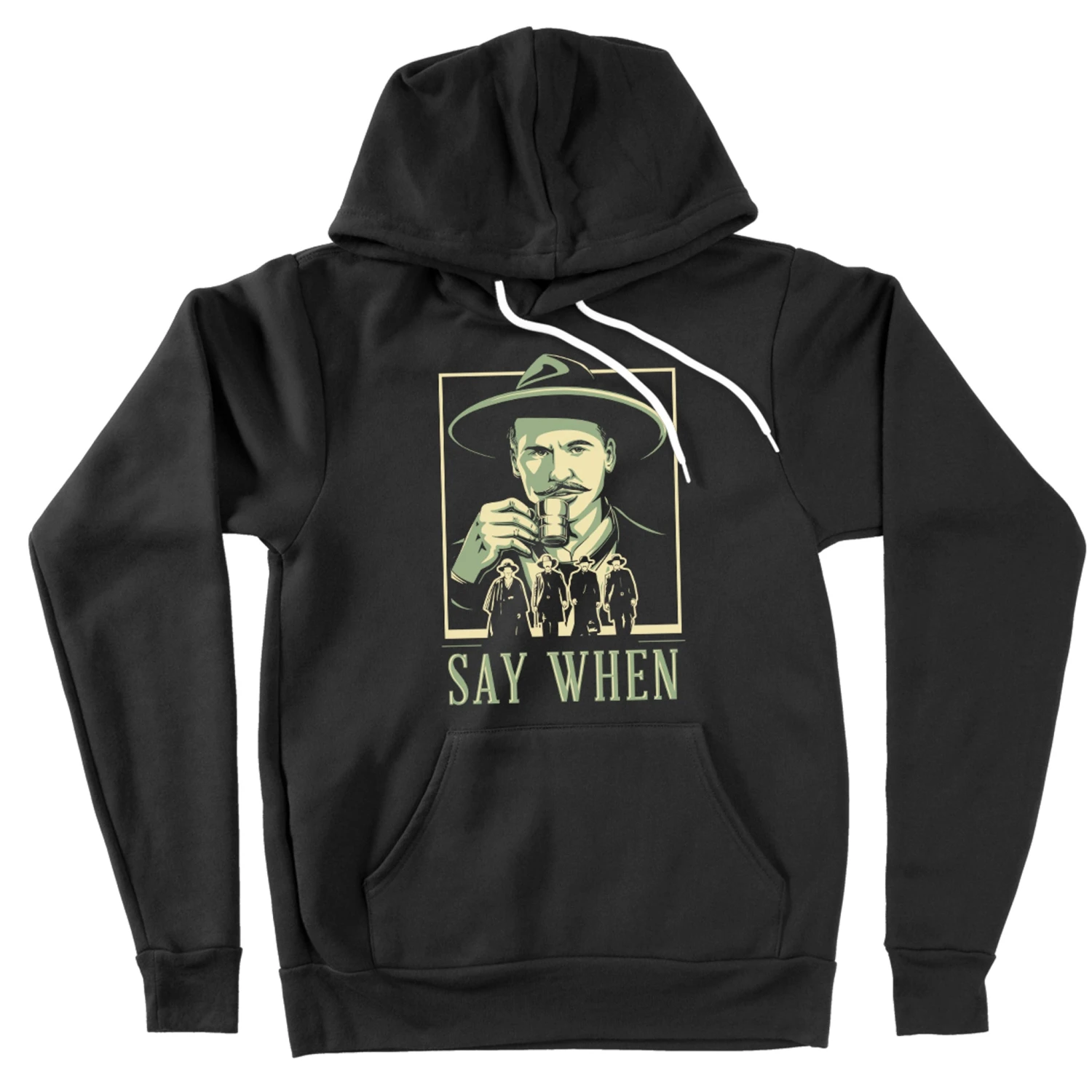 52/48 cotton/poly blend fleece. Side-seamed. White cord drawstring. Kangaroo pockets. Ribbed cuffs and waistband.
